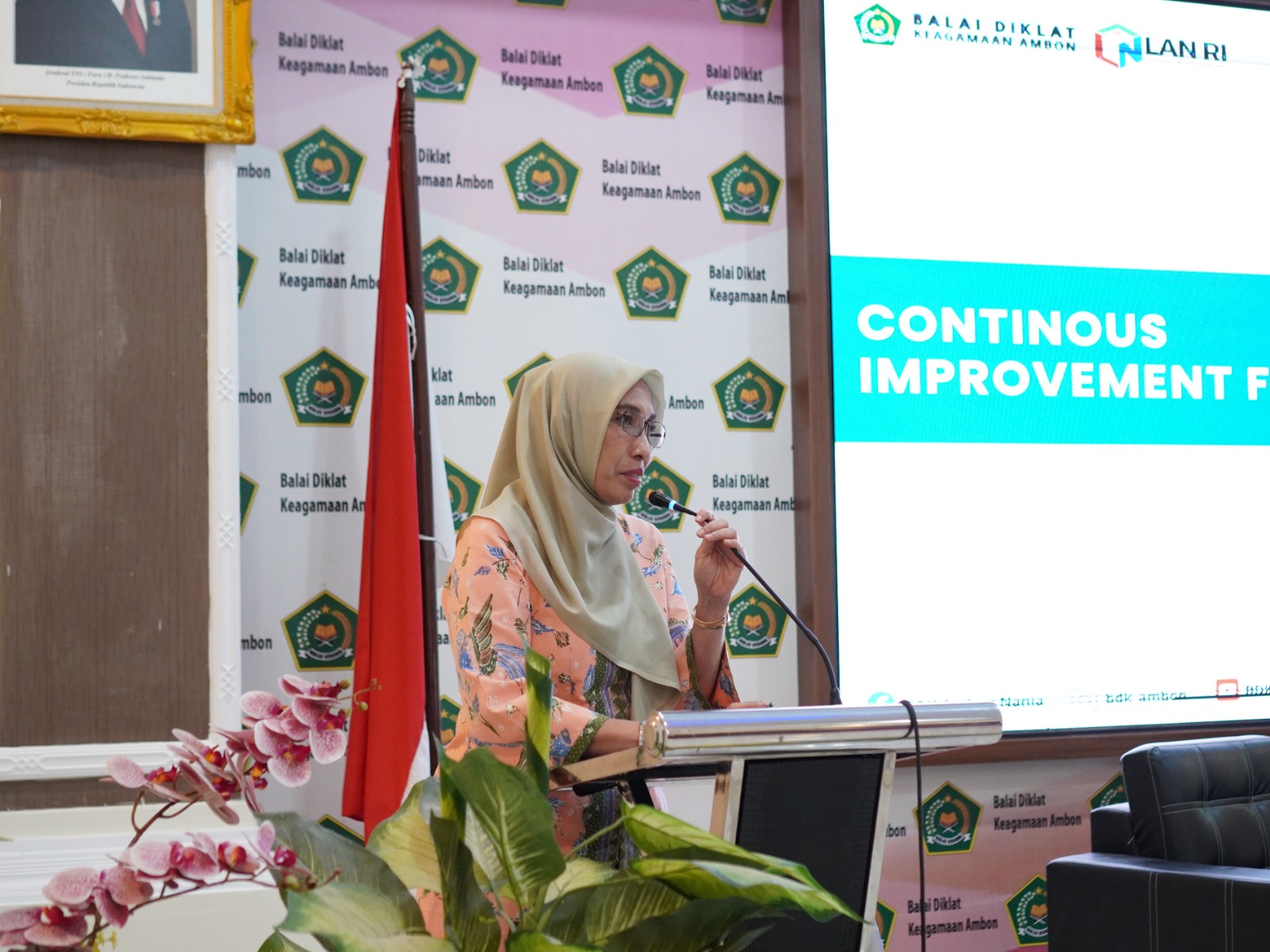 Dalam upaya mengembangkan budaya mutu secara berkelanjutan, Lembaga Administrasi Negara menggandeng BPSDM Provinsi Maluku dan Balai Diklat Keagamaan Ambon dalam giat Continous Improvement Forum yang berlangsung di gedung aula Badan Diklat Keagamaan Ambon. Kegiatan dibuka langsung oleh Dra. Army Winarty, M.Si, selaku Deputi Penjaminan Mutu Pengembangan Kapasitas & Pembelajaran ASN. BPSDM Provinsi Maluku diwakili oleh jajaran pejabat eselon III dan pejabat fungsional widyaiswara yang juga merupakan Tim Penjamin Mutu Pelatihan BPSDM Provinsi Maluku.